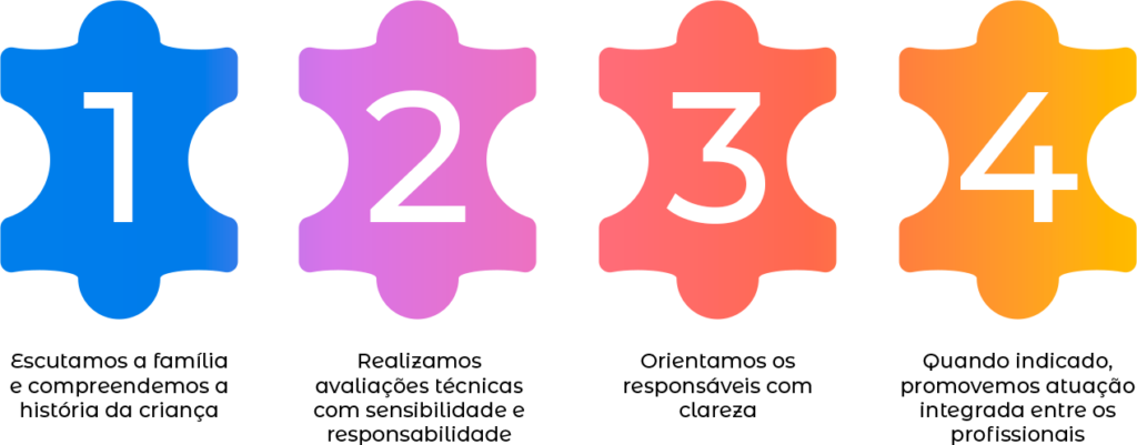 A Fonoaudiologia atua no desenvolvimento da comunicação, da linguagem, da fala e da alimentação, sempre considerando as necessidades individuais da criança.